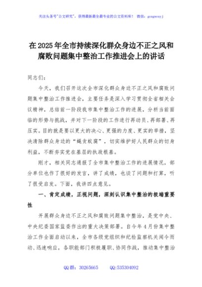 / 在2025年全市持续深化群众身边不正之风和腐败问题集中整治工作推进会上的讲话