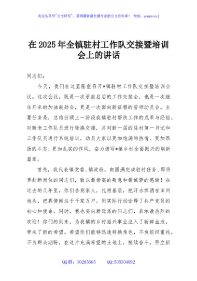 / 在2025年全镇驻村工作队交接暨培训会上的讲话