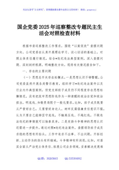 / 国企党委2025年巡察整改专题民主生活会对照检查材料