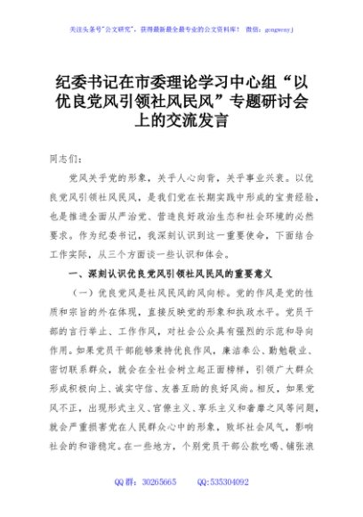 / 纪委书记在市委理论学习中心组“以优良党风引领社风民风”专题研讨会上的交流发言