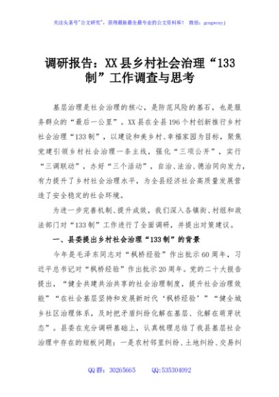 调研报告:XX县乡村社会治理“133制”工作调查与思考