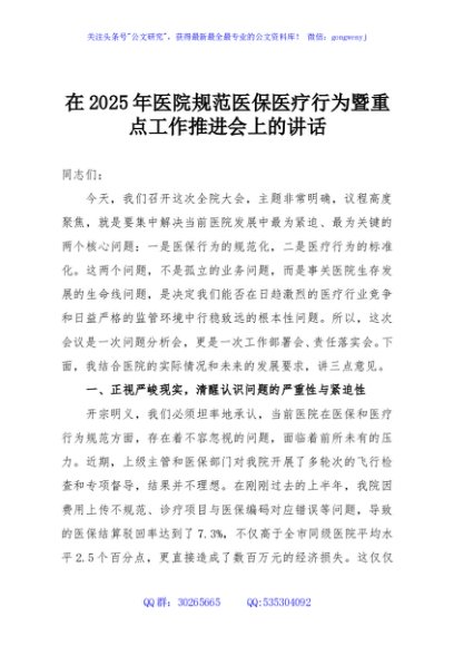 / 在2025年医院规范医保医疗行为暨重点工作推进会上的讲话
