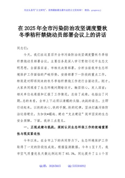 / 在2025年全市污染防治攻坚调度暨秋冬季秸秆禁烧动员部署会议上的讲话