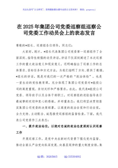 / 在2025年集团公司党委巡察组巡察公司党委工作动员会上的表态发言