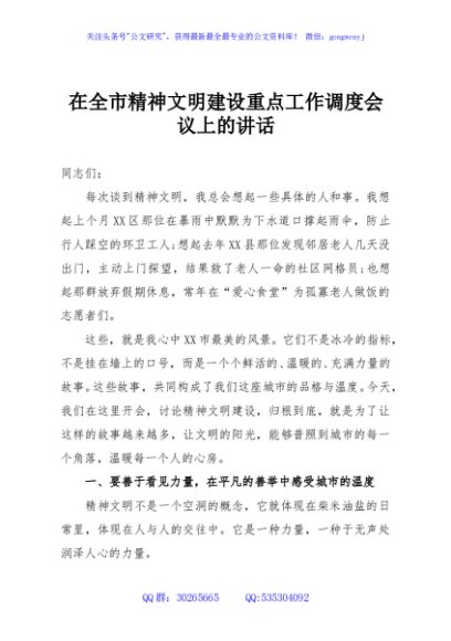 / 在全市精神文明建设重点工作调度会议上的讲话