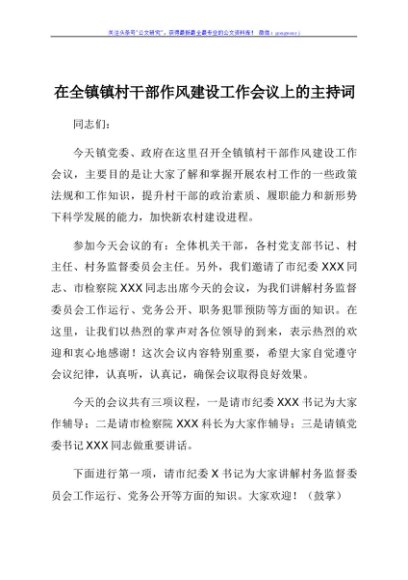 / 在全镇镇村干部作风建设工作会议上的主持词