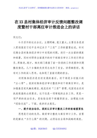 / 在XX县村集体经济审计反馈问题整改调度暨村干部离任审计推进会上的讲话