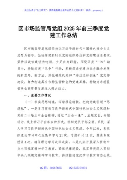 / 区市场监管局党组2025年前三季度党建工作总结