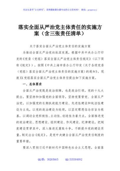/ 落实全面从严治党主体责任的实施方案(含三张责任清单)