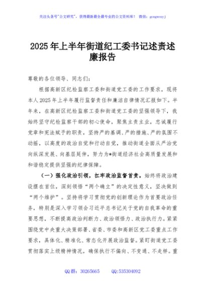 / 2025年上半年街道纪工委书记述责述廉报告