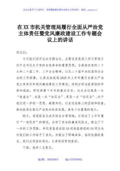 / 在XX市机关管理局履行全面从严治党主体责任暨党风廉政建设工作专题会议上的讲话