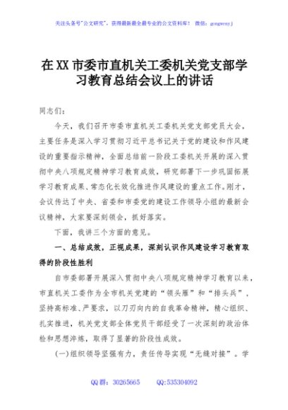 / 在XX市委市直机关工委机关党支部学习教育总结会议上的讲话