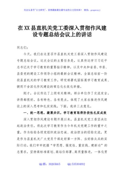 / 在XX县直机关党工委深入贯彻作风建设专题总结会议上的讲话