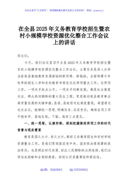 / 在全县2025年义务教育学校招生暨农村小规模学校资源优化整合工作会议上的讲话