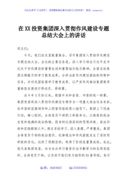 / 在XX投资集团深入贯彻作风建设专题总结大会上的讲话