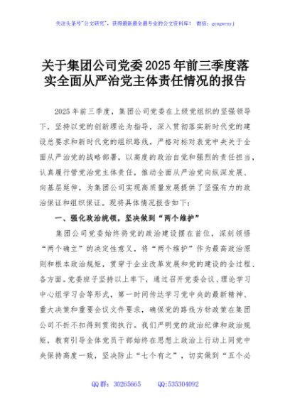/ 关于集团公司党委2025年前三季度落实全面从严治党主体责任情况的报告