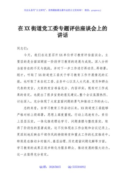 / 在XX街道党工委专题评估座谈会上的讲话