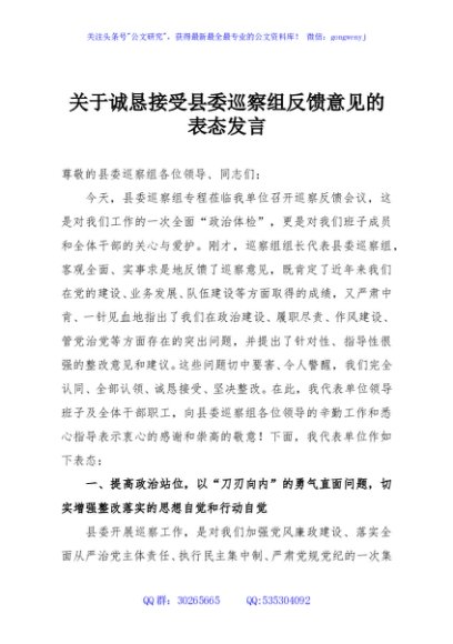 / 关于诚恳接受县委巡察组反馈意见的表态发言