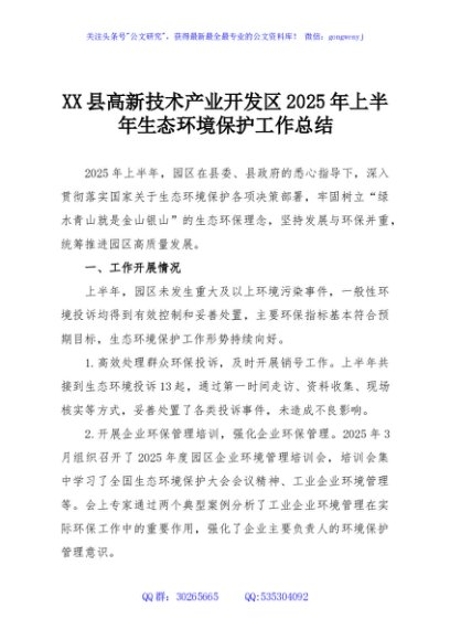 / XX县高新技术产业开发区2025年上半年生态环境保护工作总结