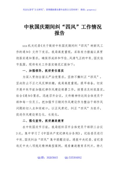 / 中秋国庆期间纠“四风”工作情况报告