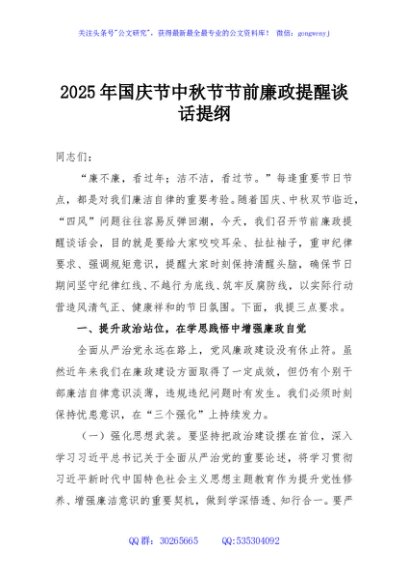 / 2025年国庆节中秋节节前廉政提醒谈话提纲