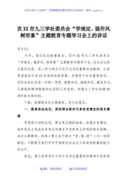 / 在XX市九三学社委员会“学规定、强作风、树形象”主题教育专题学习会上的讲话