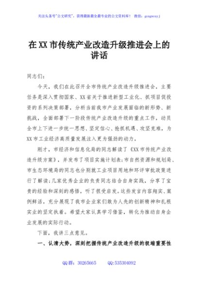 / 在XX市传统产业改造升级推进会上的讲话