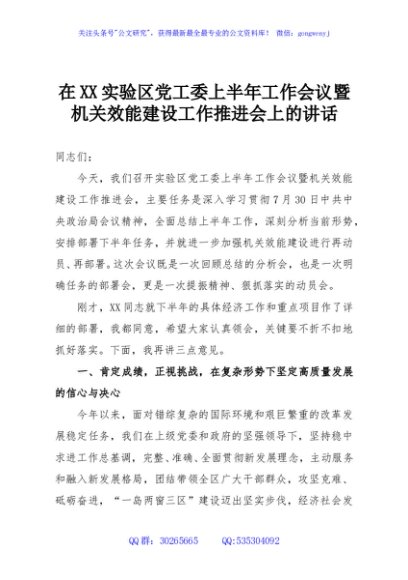 / 在XX实验区党工委上半年工作会议暨机关效能建设工作推进会上的讲话