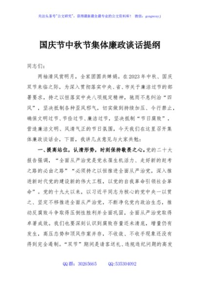 / 国庆节中秋节集体廉政谈话提纲