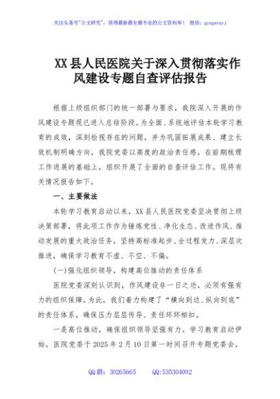 / XX县人民医院关于深入贯彻落实作风建设专题自查评估报告