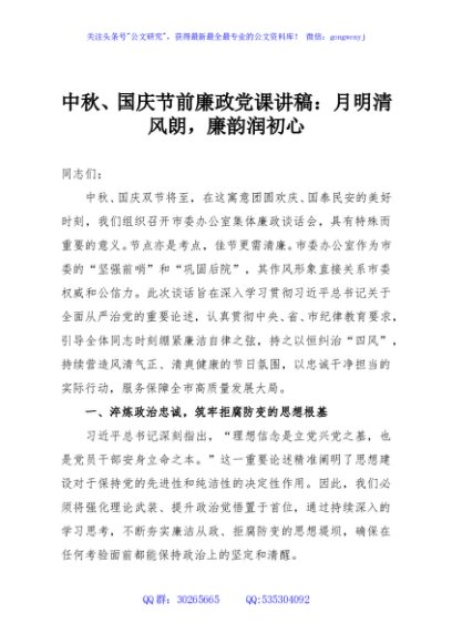 / 中秋、国庆节前廉政党课讲稿:月明清风朗,廉韵润初心