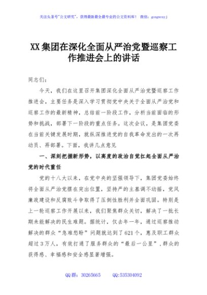 / XX集团在深化全面从严治党暨巡察工作推进会上的讲话