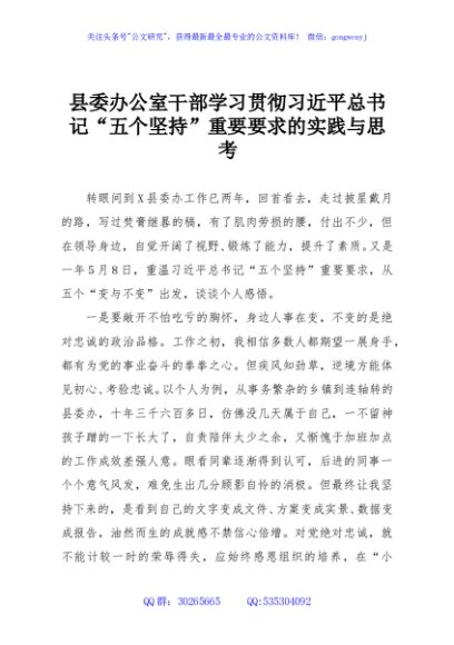 / 县委办公室干部学习贯彻习近平总书记“五个坚持”重要要求的实践与思考