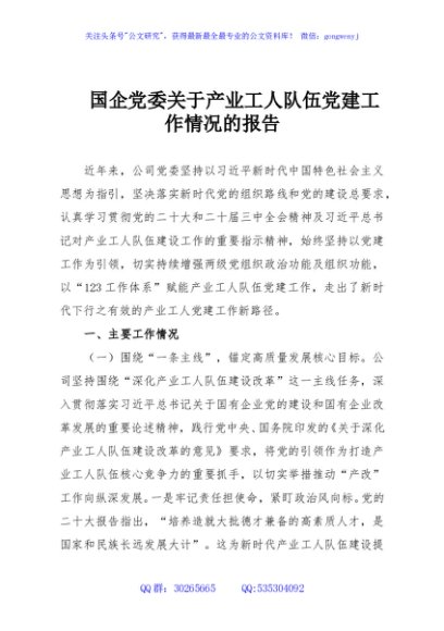 / 国企党委关于产业工人队伍党建工作情况的报告