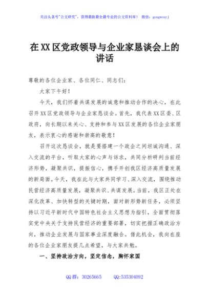 / 在XX区党政领导与企业家恳谈会上的讲话
