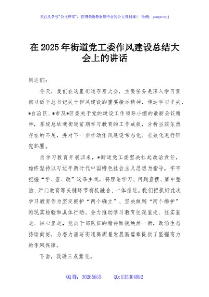 / 在2025年街道党工委作风建设总结大会上的讲话