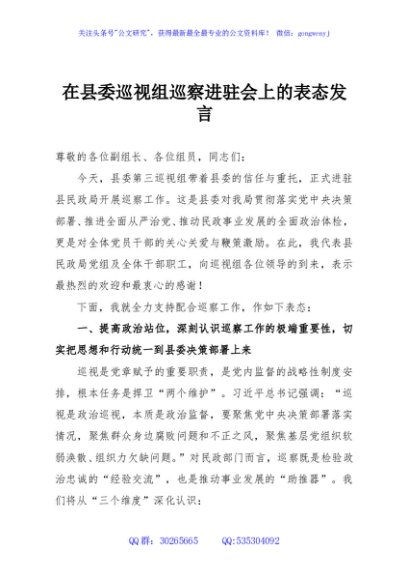 / 在县委巡视组巡察进驻会上的表态发言