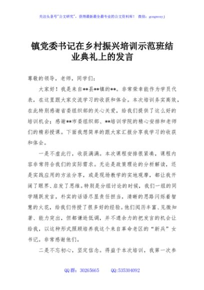 / 镇党委书记在乡村振兴培训示范班结业典礼上的发言