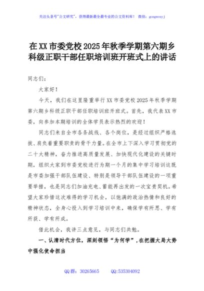 / 在XX市委党校2025年秋季学期第六期乡科级正职干部任职培训班开班式上的讲话