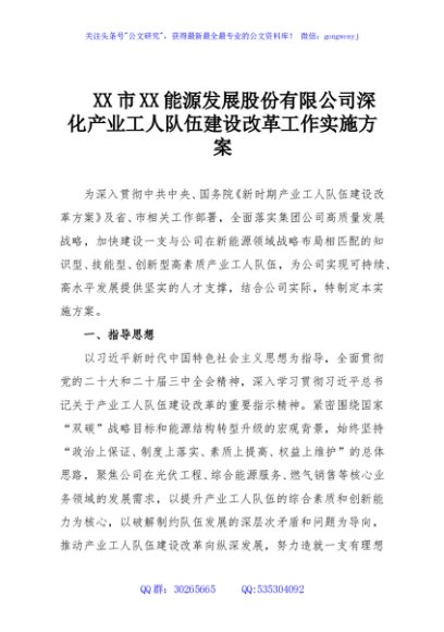 / XX市XX能源发展股份有限公司深化产业工人队伍建设改革工作实施方案
