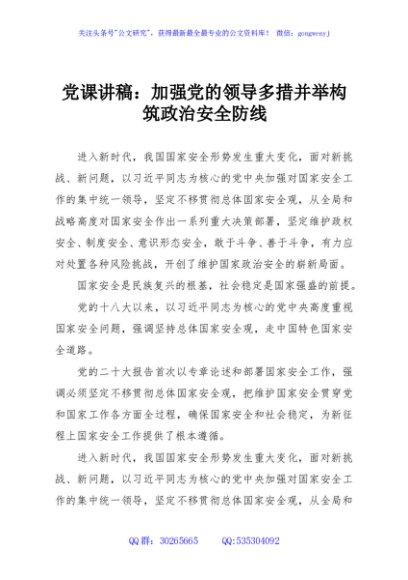 / 党课讲稿:加强党的领导多措并举构筑政治安全防线