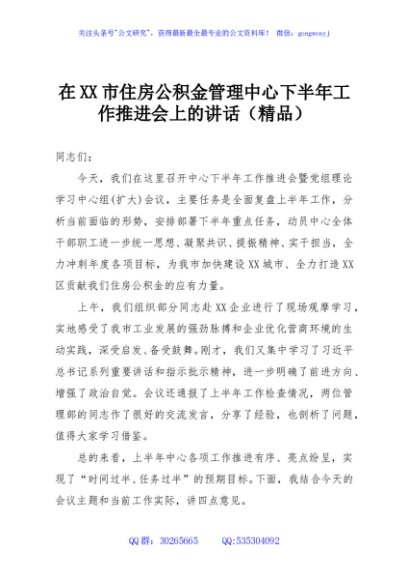 / 在XX市住房公积金管理中心下半年工作推进会上的讲话(精品)