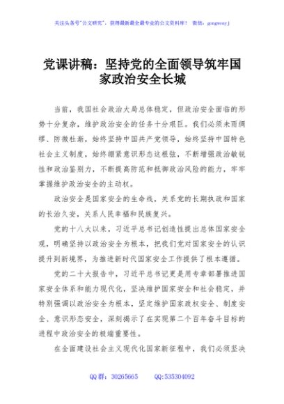 / 党课讲稿:坚持党的全面领导筑牢国家政治安全长城