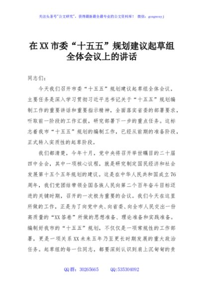 / 在XX市委“十五五”规划建议起草组全体会议上的讲话