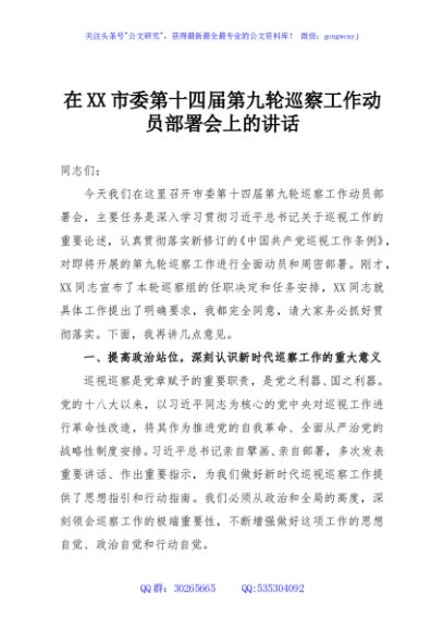 / 在XX市委第十四届第九轮巡察工作动员部署会上的讲话