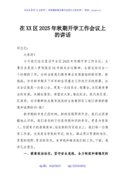 / 在XX区2025年秋期开学工作会议上的讲话