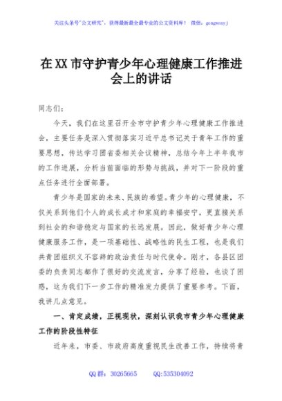 / 在XX市守护青少年心理健康工作推进会上的讲话