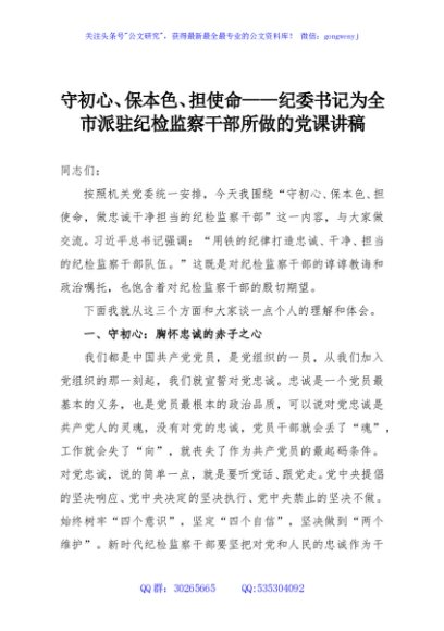 / 守初心、保本色、担使命——纪委书记为全市派驻纪检监察干部所做的党课讲稿