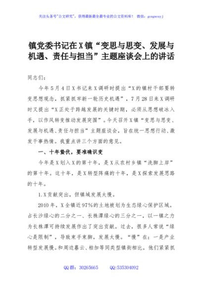 / 镇党委书记在X镇“变思与思变、发展与机遇、责任与担当”主题座谈会上的讲话