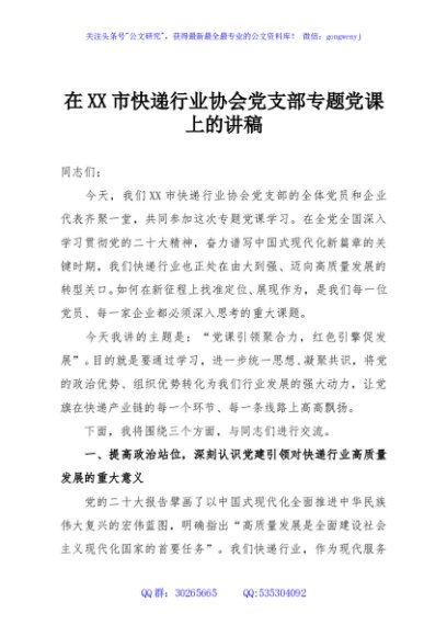 / 在XX市快递行业协会党支部专题党课上的讲稿